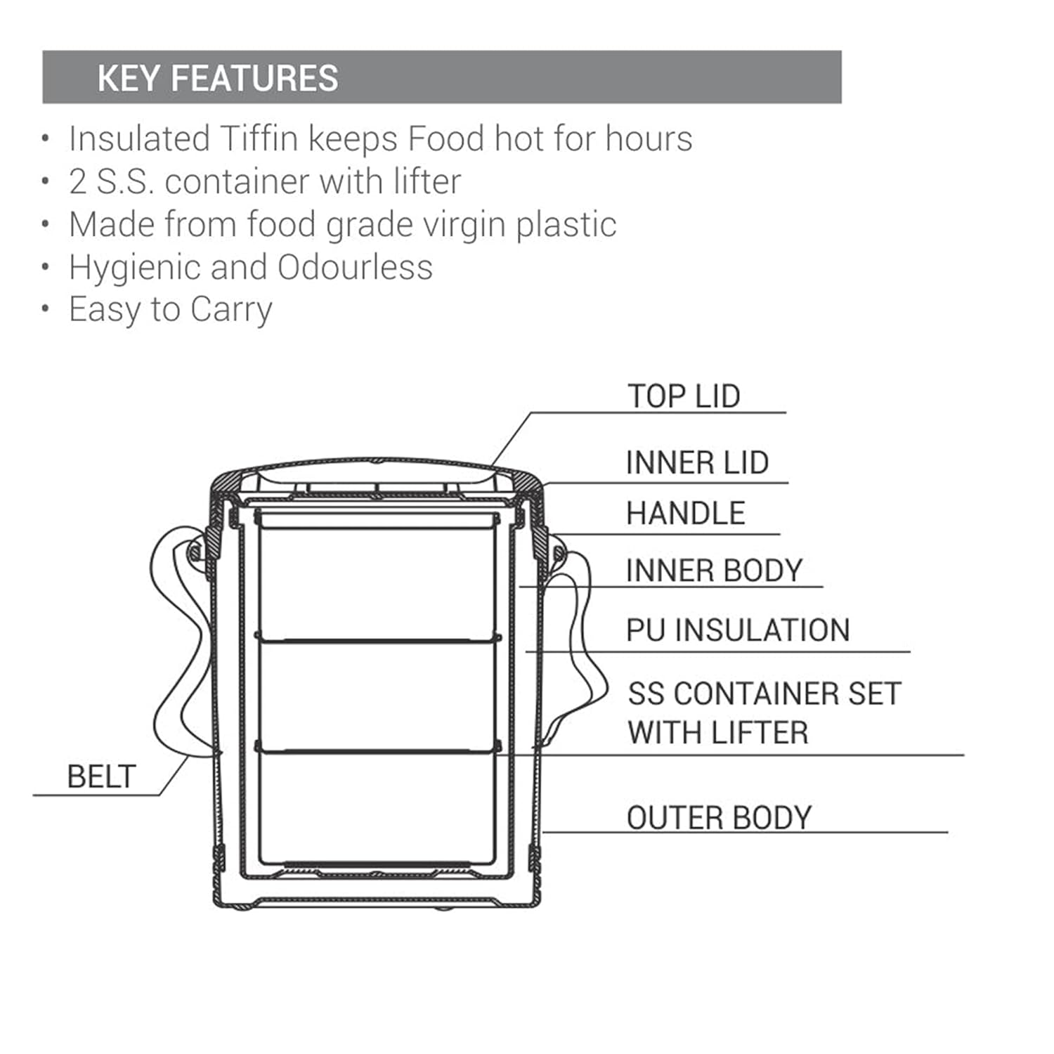 - Versatile Usage: Perfect for picnics, daily lunches, and travel, this tiffin allows you to transport a variety of foods without worrying about leaks or odours. Whether you're packing healthy meals for work, enjoying outdoor activities, or taking home-cooked dishes on road trips, it keeps your food fresh and at the right temperature.