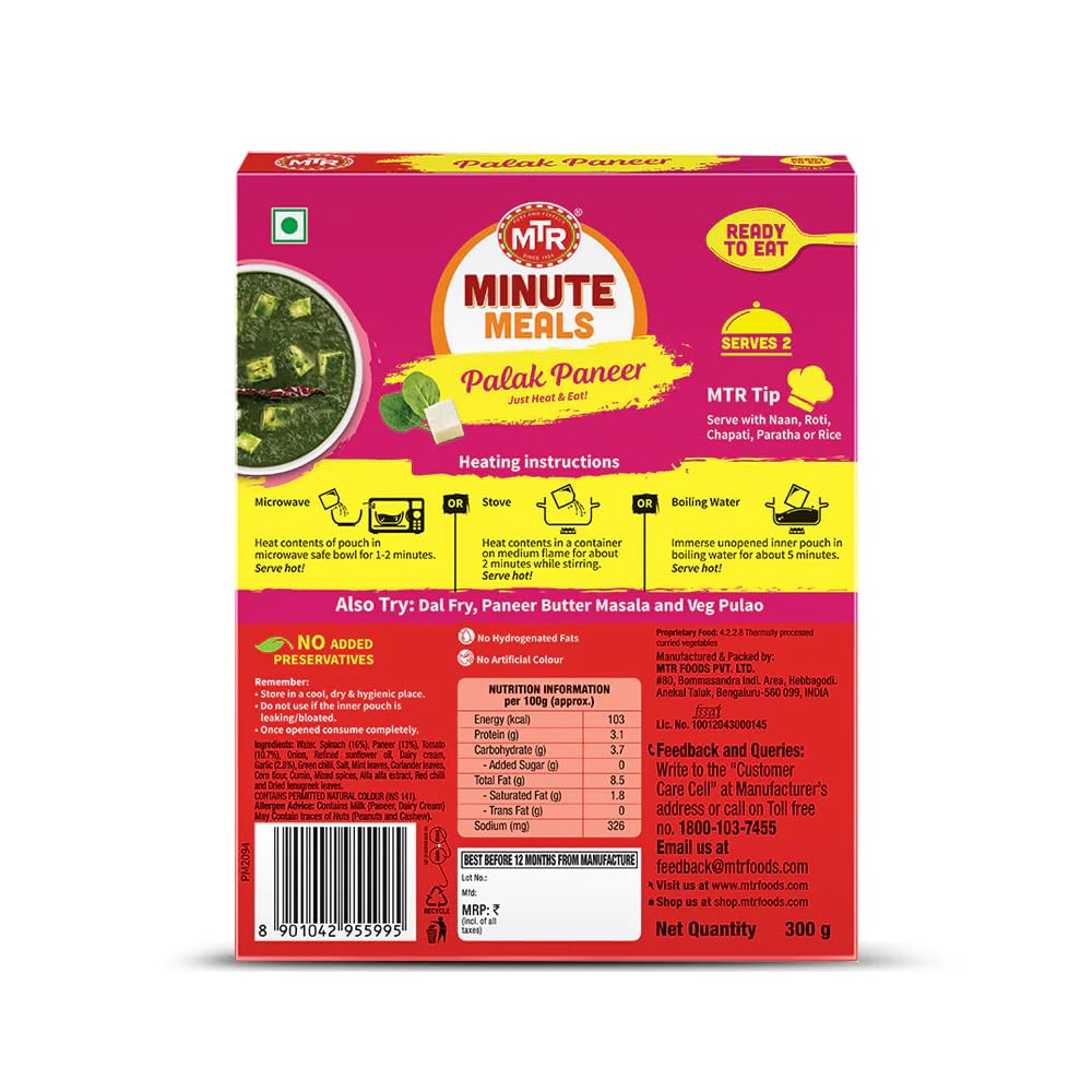 - BrandMTRDiet TypeVegetarianNumber of Items1FlavourPalak PaneerItem Weight0.3 Kilograms