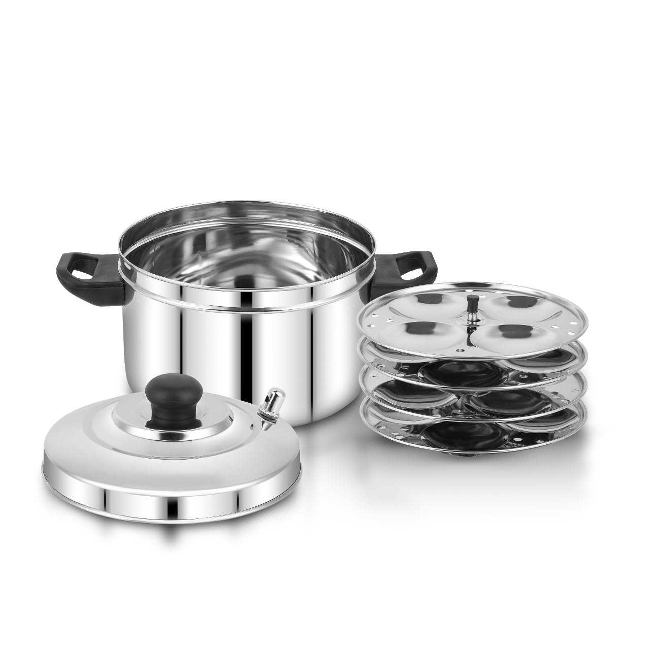 - Package contents: 4 plates with 16 idli pots in each and a stainless steel idli cooker with a lid