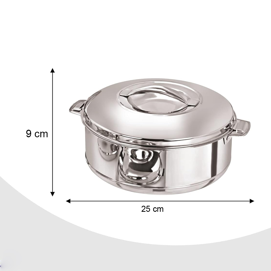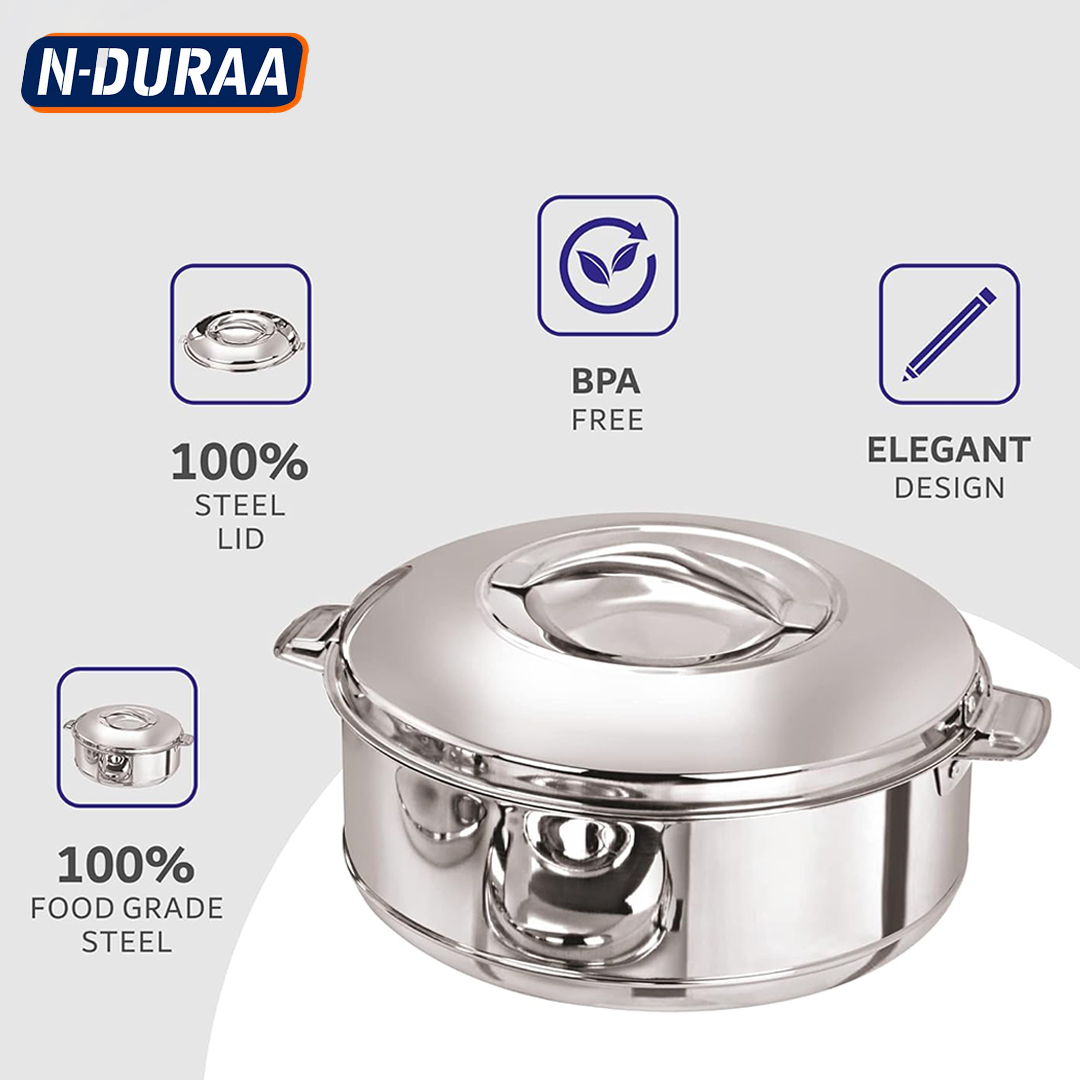 - MaterialStainless SteelBrandN - DuraaColourSilverFinish TypemirrorShapeRoundCapacity1500 MLItem Weight300 GramsProduct Care InstructionsThe product is not a gas/induction safeWith LidYesIs Dishwasher SafeYes