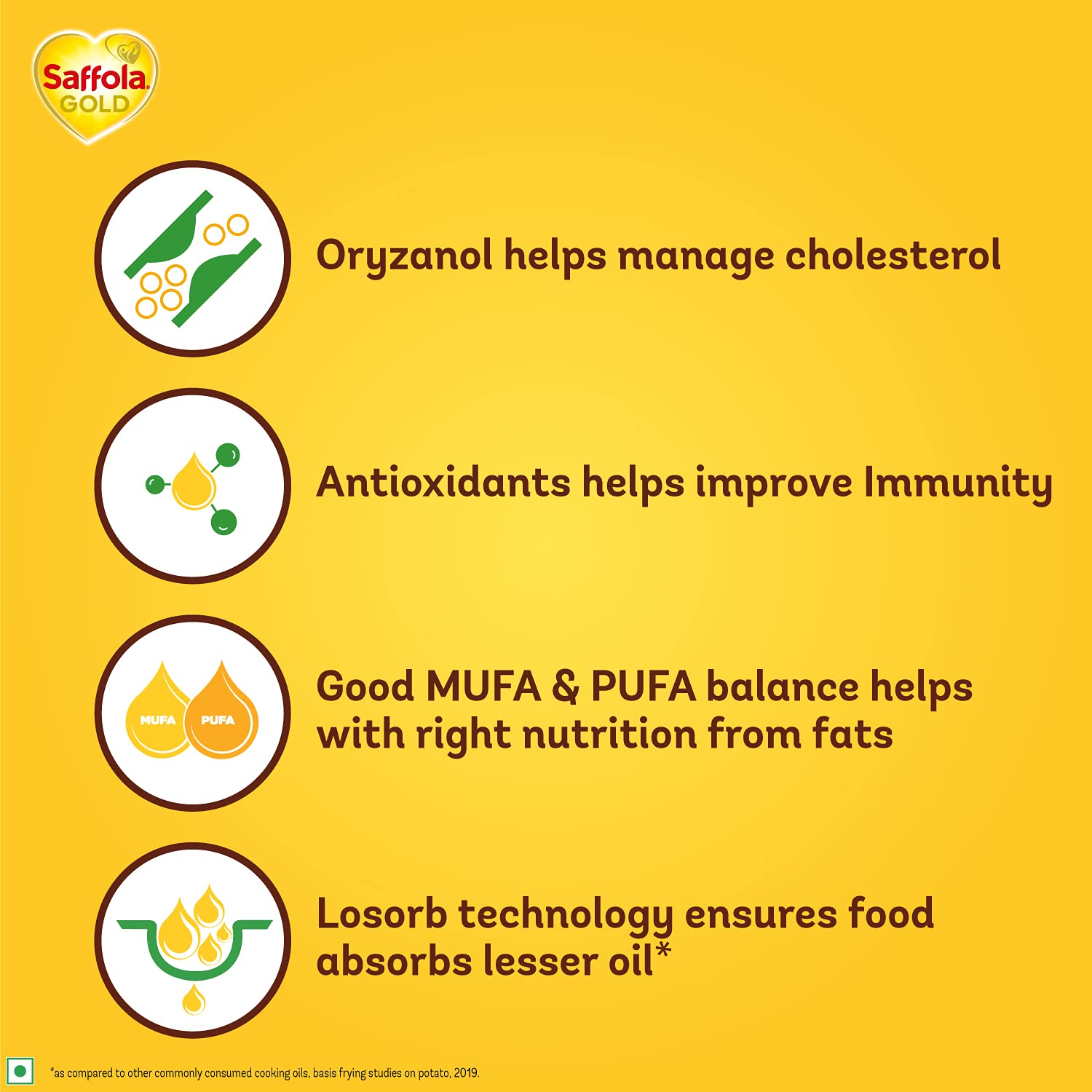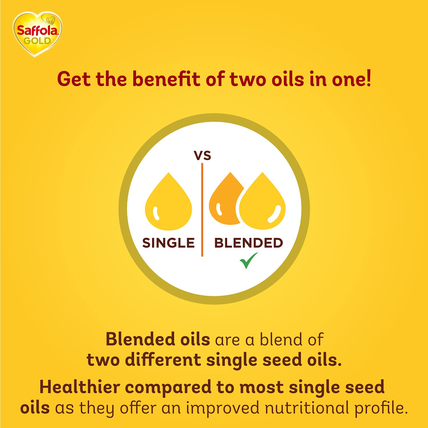 - Saffola Gold’s Dual Seed Technology with goodness of 2 oils in 1, rice bran oil and sunflower oil, ensures a good balance of MUFA, PUFA for better heart health in comparison to single seed oils