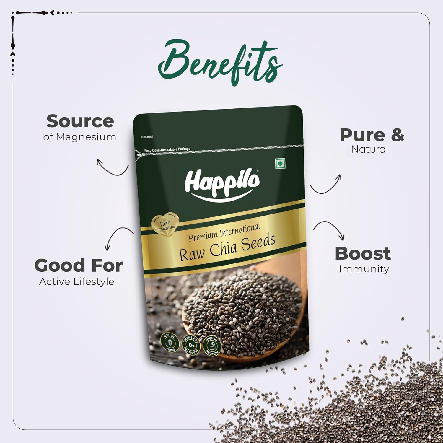 - 100% Natural, gluten Free, Additives Free, Perfect for all. Happilo partners with farmers to source the finest chia seeds for you. Soak them for a satisfying pudding, porridge or smoothies.