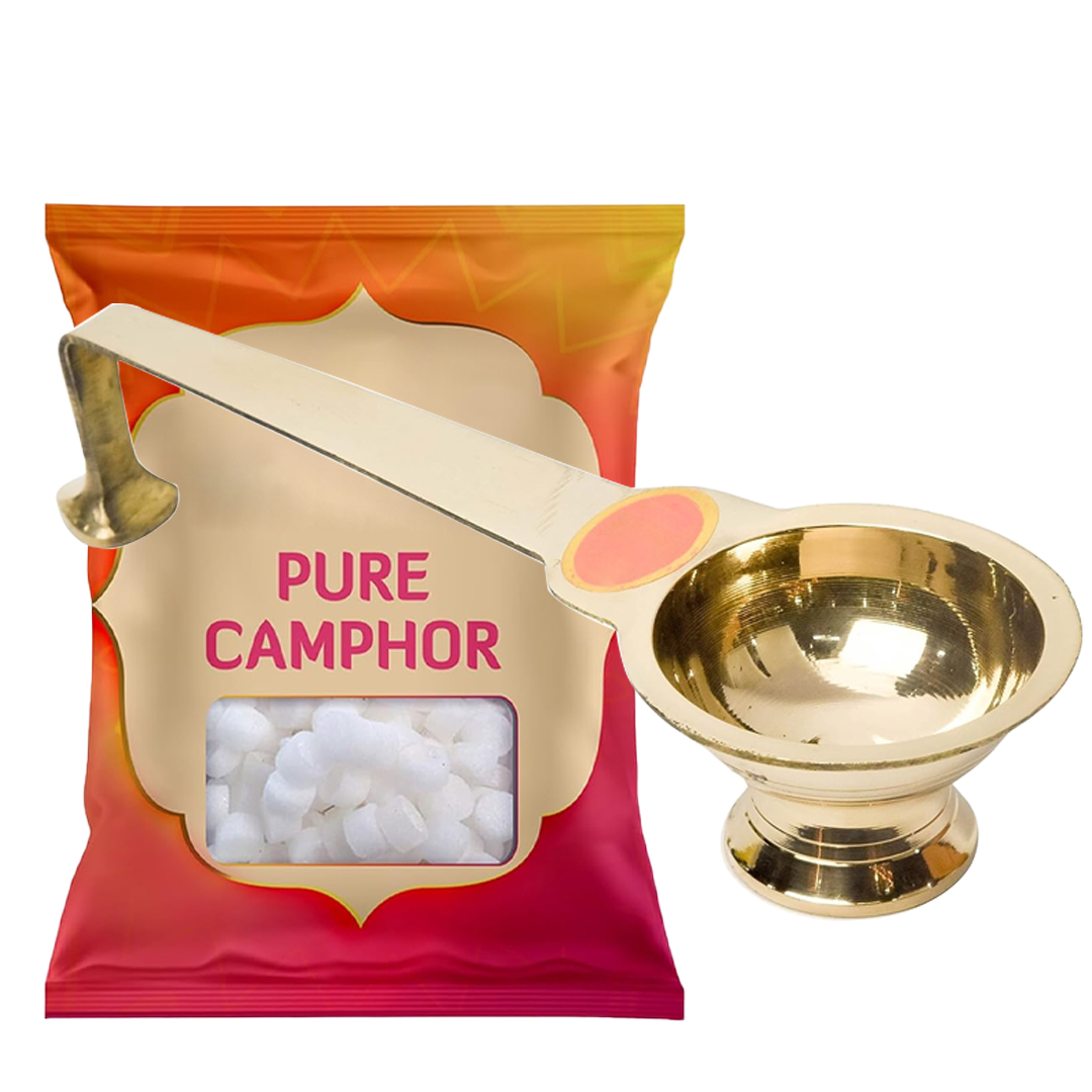 OM BHAKTI Camphor 60 nos & Brass Camphor Burner Aarti Stand | Kapoor Dani Holder for Pooja Rituals Combo