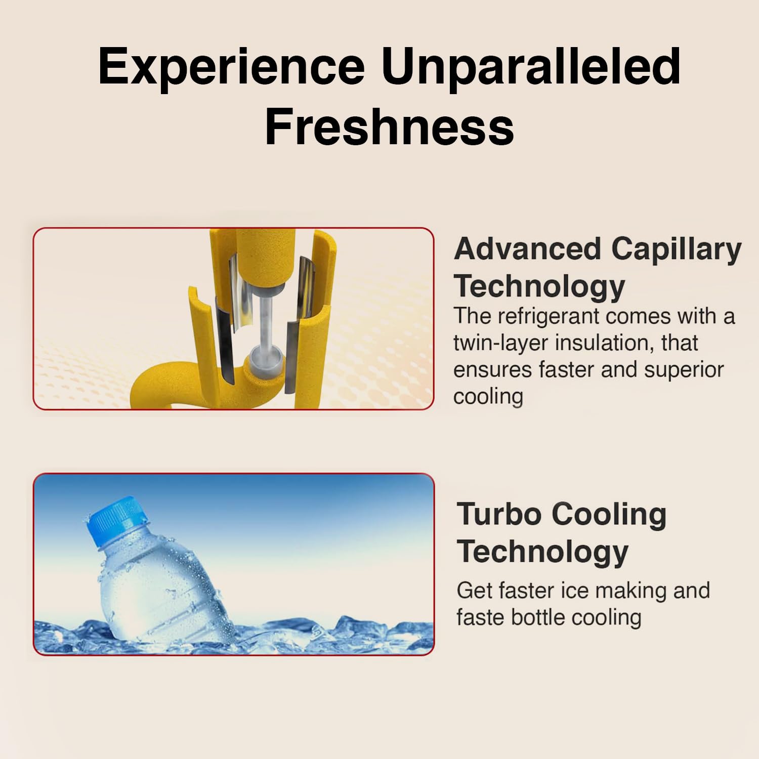 - Advanced capillary technology: With advanced capillary technology, the capillary tube which carries the refrigerant, is given twin-layer insulation, that ensures faster and superior cooling