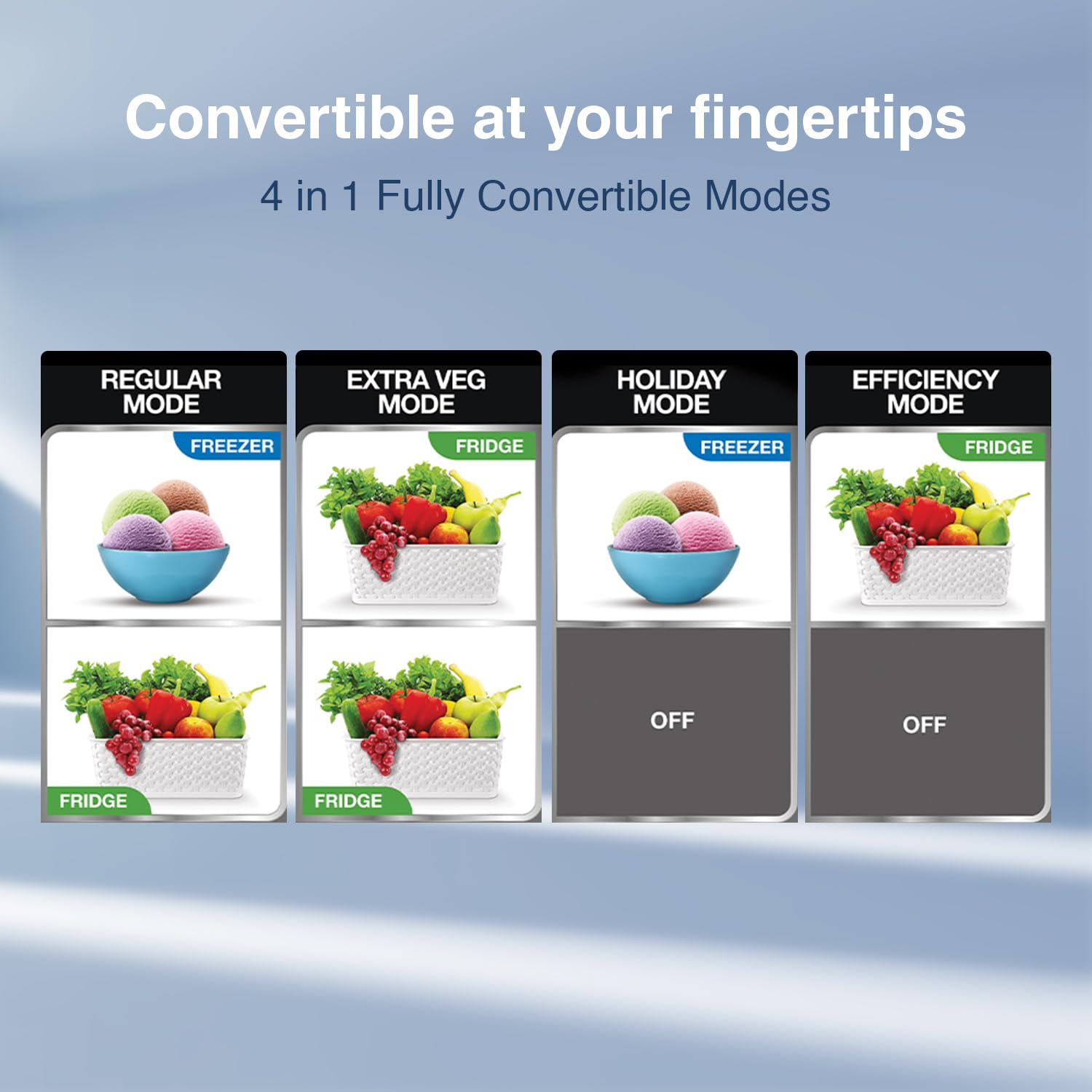 - Fridge Freezer Convert: With new Fridge Freezer Convert flexibility, you may use both the freezer and the fridge space as per your convenience and convert the freezer into fridge or only use the freezer when on holidays for more savings on your electricity bill ; Farm Freshness upto 30 days: Keep your fruits and vegetables Farm fresh upto 30 days with the help of Cool Balance Technology and Moisture control technology