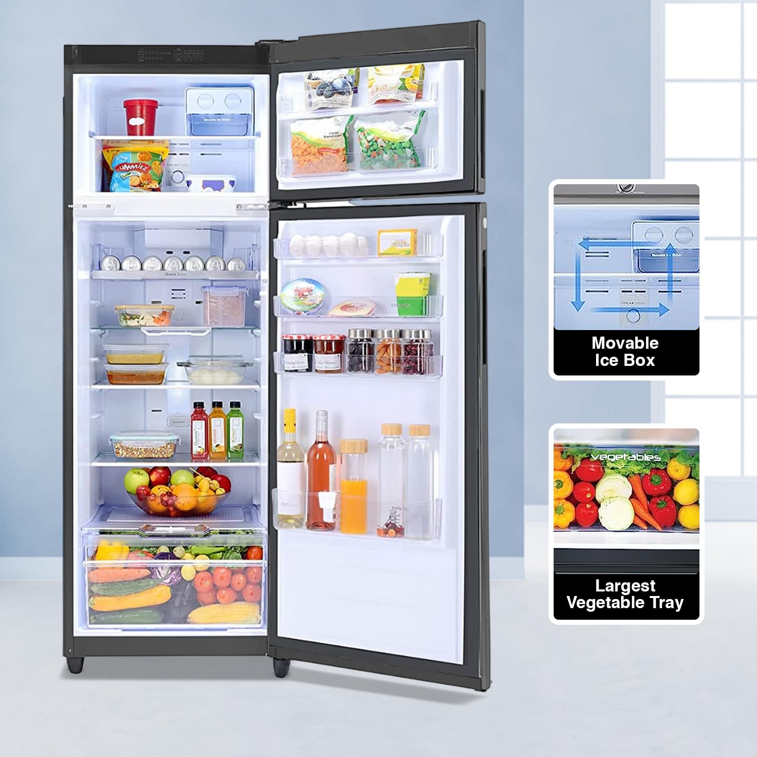 - Storage Description : Fresh food capacity : 222 L | Freezer capacity : 50 L | shelves : 3 | Shelf type : Toughened Glass | Vegetable Storage Space : 27 L