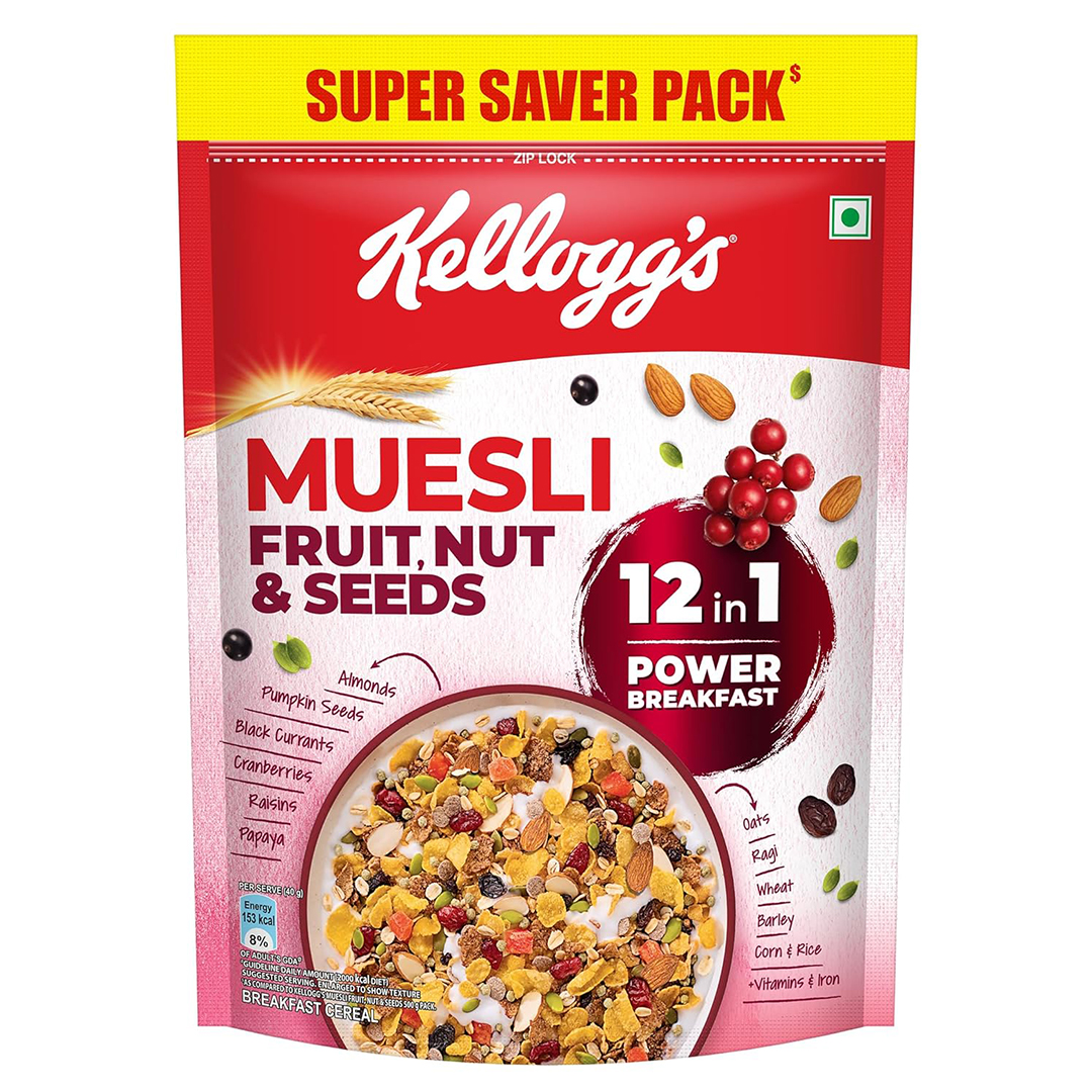 - Power Breakfast for a Healthy Start: Made with 6 nutritious grains & 6 delicious inclusions – the ‘New Kellogg’s Muesli Fruit Nut & Seeds 12-in-1 Power Breakfast comes with the goodness of six baked grains (Oats, Ragi, Wheat, Barley Corn & Rice) and an abundance of six dried fruits, nuts and super-seeds (Almonds, Pumpkin Seeds, Black Currants, Cranberries, Raisins & Papaya); giving this Muesli a yummy blend of flavour and crunchy texture in your breakfast bowl.
