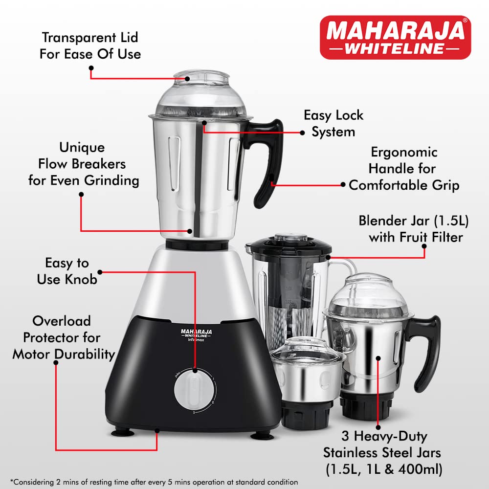 Maharaja Whiteline Infinimax Elite Mixer Grinder, Long Lasting Performance with 750 Watt Motor | Jar Flow Breakers | 5 Years Warranty on Motor (Black & Grey)