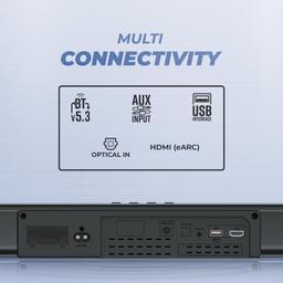 - This soundbar is equipped with multi-connectivity options and its ability to support BTv5.3 shows its technologically advanced design. This soundbar now allows you to connect via HDMI (eARC), 3.5mm AUX line input, optical IN, and USB with MP3 audio files and AUX for seamless audio streaming.